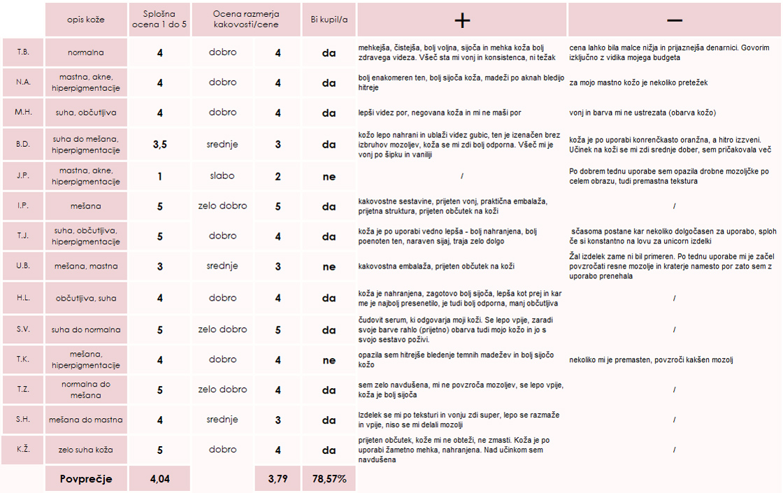 Izdelek bi ocenila s 5, razmerje cene in kakovosti/učinka kot zelo dobro, izdelek pa bi z veseljem ponovno kupila in verjamem da se bo še znašel v moji rutini. Upam na kakšno ponovno sodelovanje in se zahvaljujem za priložnost!